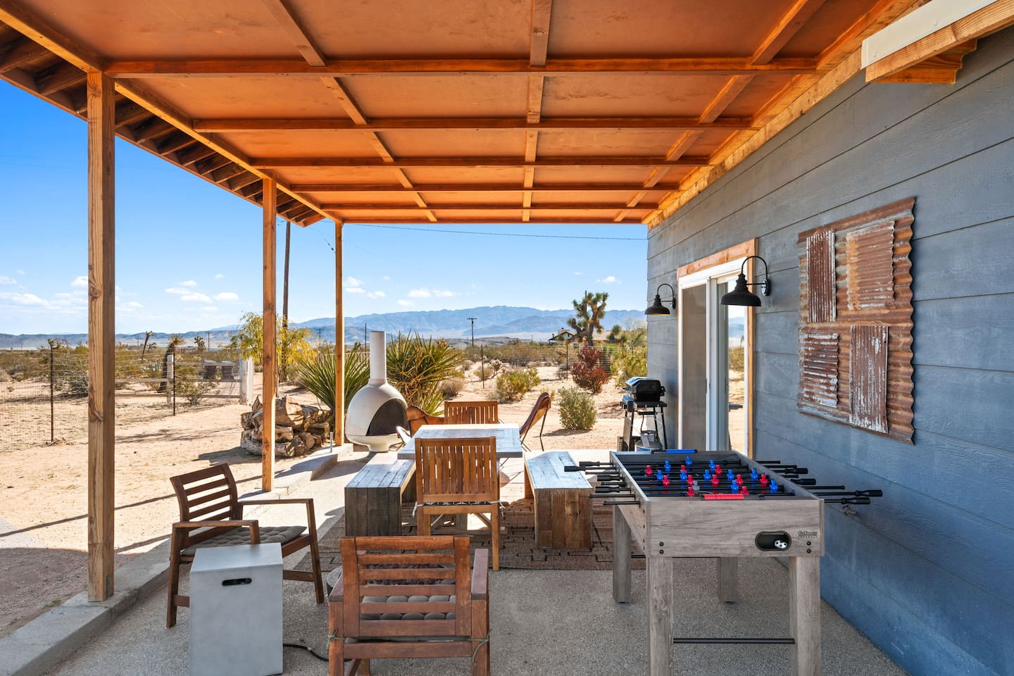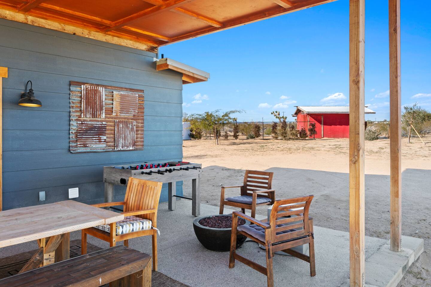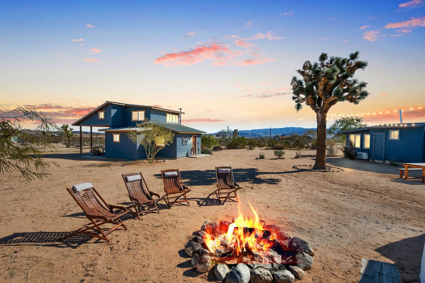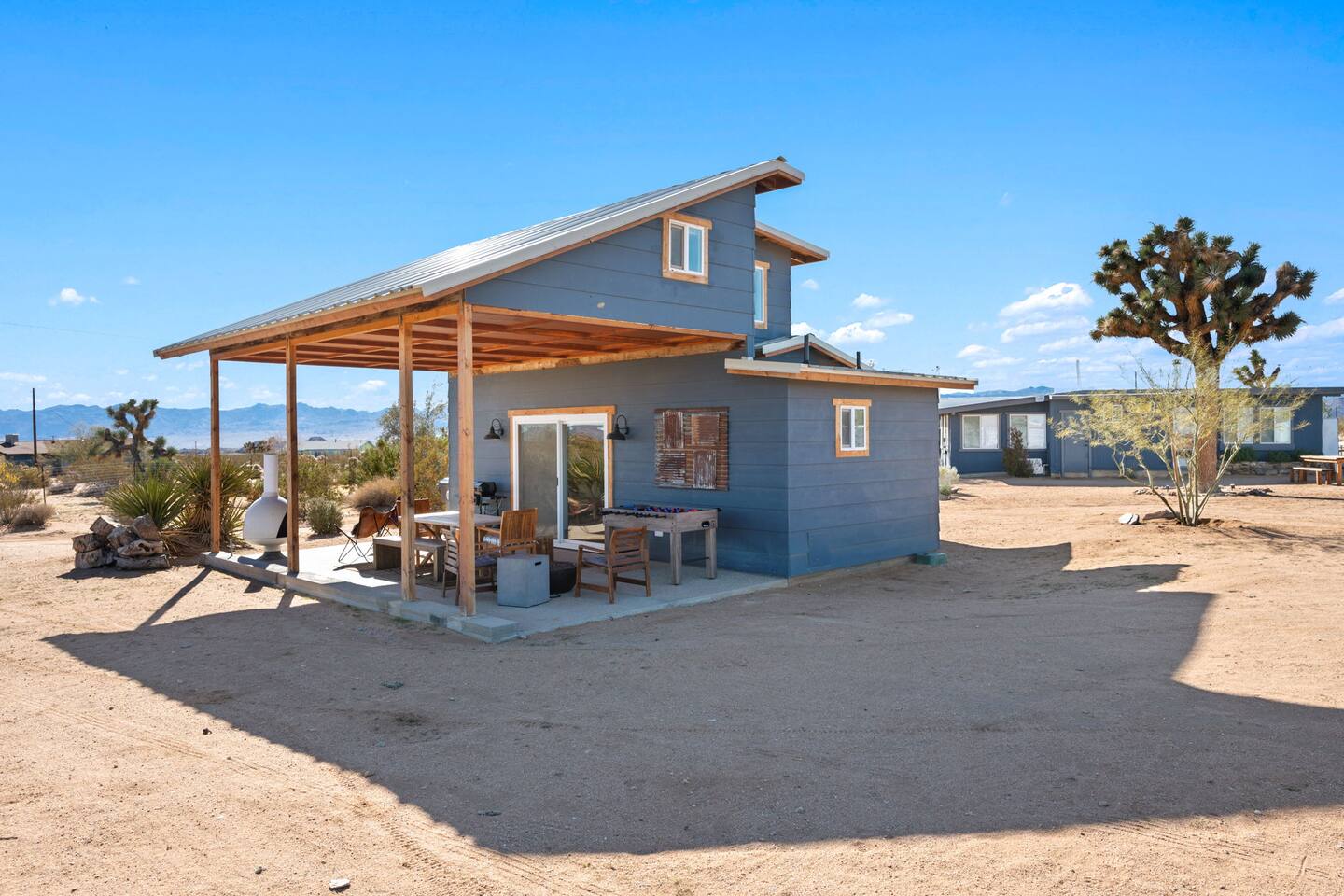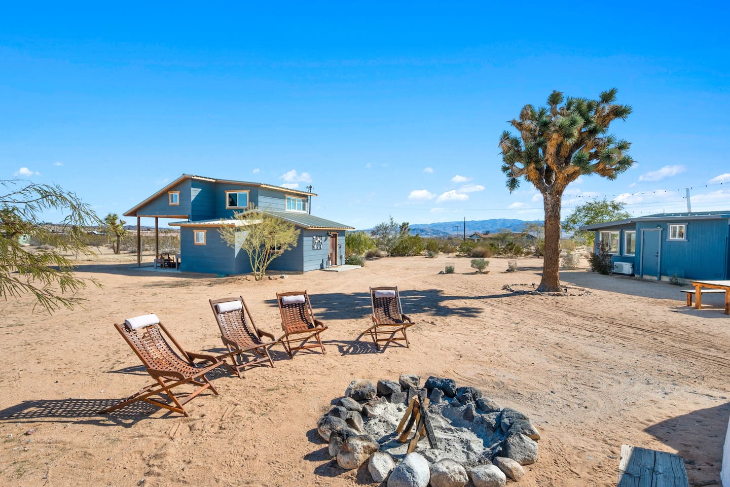 Inside, both homes feature fully equipped kitchens stocked with everything you need to cook up a delicious meal. Whether you prefer the ease of a Keurig or the tradition of a drip coffee maker, we’ve got you covered. Each kitchen also includes complimentary coffee and tea, cooking and baking basics, a toaster, microwave, and a gas range with oven—making meal prep simple and stress-free. Each house features two bedrooms and one bathroom, stocked with plush bedding, linens, towels, and toiletries for a comfortable stay. Main House: Bedroom 1 – Queen bed with a trundle single bed (for kids) Bedroom 2 – Queen bed with a trundle single bed (for kids) + a pack 'n play Living Room – Queen-size sleeper sofa & one queen air mattress Casita: Bedroom 1 – Queen bed Bedroom 2 – Queen bed with two single floor mattresses Living Room – Queen-size sleeper sofa & one queen air mattress Unwind under the stars in the hot tub or gather around the warmth of two gas firepits. Fire up the two outdoor grills to prepare a delicious feast, then enjoy your meal at the outdoor dining table or relax in the cozy lounge area. For entertainment, enjoy a classic evening by the wood firepit, challenge friends to a game of foosball or cornhole, or choose from a selection of board games for some friendly competition. With ample outdoor space to relax and connect, this Airbnb offers the perfect setting to unwind, socialize, and experience the beauty of Joshua Tree. Book your stay today and create unforgettable memories in this desert oasis!Inside, both homes feature fully equipped kitchens stocked with everything you need to cook up a delicious meal. Whether you prefer the ease of a Keurig or the tradition of a drip coffee maker, we’ve got you covered. Each kitchen also includes complimentary coffee and tea, cooking and baking basics, a toaster, microwave, and a gas range with oven—making meal prep simple and stress-free. Each house features two bedrooms and one bathroom, stocked with plush bedding, linens, towels, and toiletries for a comfortable stay. Main House: Bedroom 1 – Queen bed with a trundle single bed (for kids) Bedroom 2 – Queen bed with a trundle single bed (for kids) + a pack 'n play Living Room – Queen-size sleeper sofa & one queen air mattress Casita: Bedroom 1 – Queen bed Bedroom 2 – Queen bed with two single floor mattresses Living Room – Queen-size sleeper sofa & one queen air mattress Unwind under the stars in the hot tub or gather around the warmth of two gas firepits. Fire up the two outdoor grills to prepare a delicious feast, then enjoy your meal at the outdoor dining table or relax in the cozy lounge area. For entertainment, enjoy a classic evening by the wood firepit, challenge friends to a game of foosball or cornhole, or choose from a selection of board games for some friendly competition. With ample outdoor space to relax and connect, this Airbnb offers the perfect setting to unwind, socialize, and experience the beauty of Joshua Tree. Book your stay today and create unforgettable memories in this desert oasis!