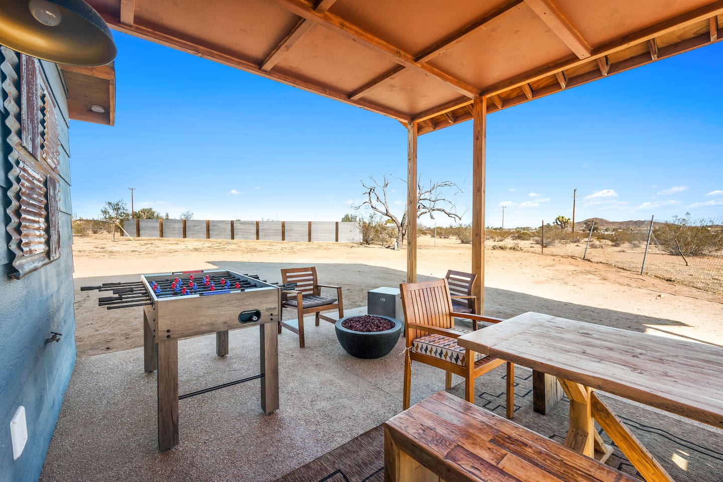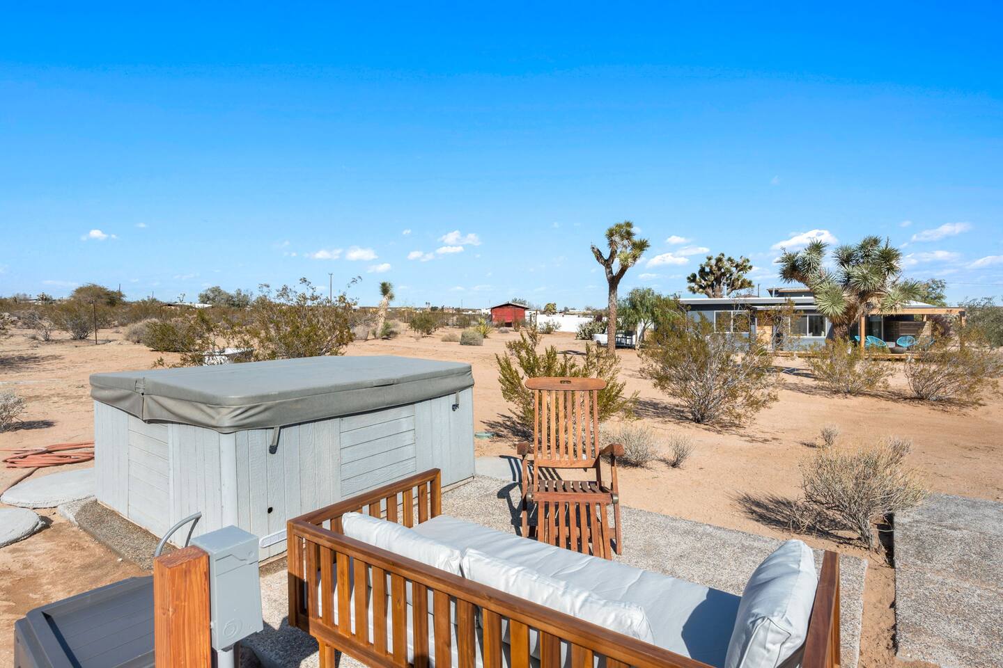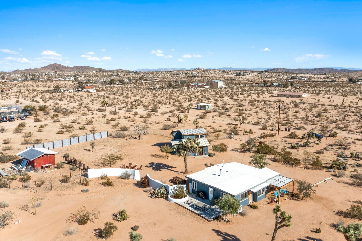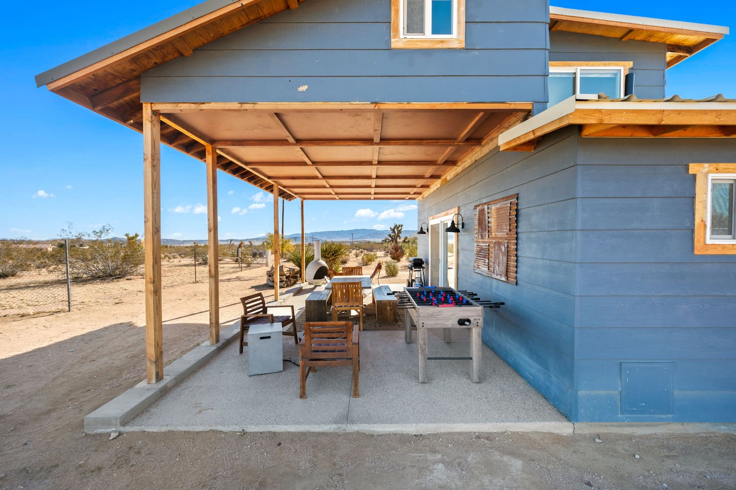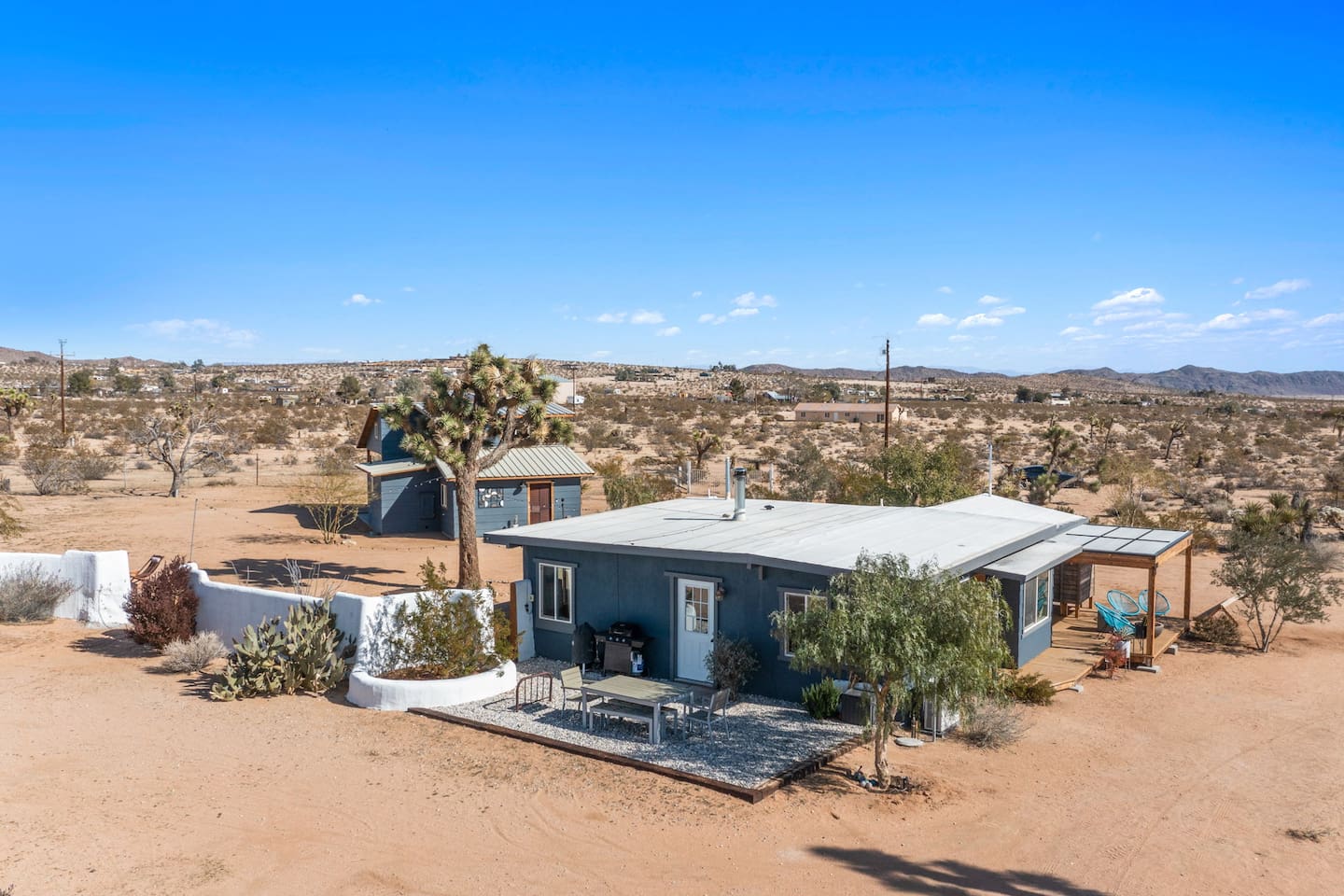 Inside, both homes feature fully equipped kitchens stocked with everything you need to cook up a delicious meal. Whether you prefer the ease of a Keurig or the tradition of a drip coffee maker, we’ve got you covered. Each kitchen also includes complimentary coffee and tea, cooking and baking basics, a toaster, microwave, and a gas range with oven—making meal prep simple and stress-free. Each house features two bedrooms and one bathroom, stocked with plush bedding, linens, towels, and toiletries for a comfortable stay. Main House: Bedroom 1 – Queen bed with a trundle single bed (for kids) Bedroom 2 – Queen bed with a trundle single bed (for kids) + a pack 'n play Living Room – Queen-size sleeper sofa & one queen air mattress Casita: Bedroom 1 – Queen bed Bedroom 2 – Queen bed with two single floor mattresses Living Room – Queen-size sleeper sofa & one queen air mattress Unwind under the stars in the hot tub or gather around the warmth of two gas firepits. Fire up the two outdoor grills to prepare a delicious feast, then enjoy your meal at the outdoor dining table or relax in the cozy lounge area. For entertainment, enjoy a classic evening by the wood firepit, challenge friends to a game of foosball or cornhole, or choose from a selection of board games for some friendly competition. With ample outdoor space to relax and connect, this Airbnb offers the perfect setting to unwind, socialize, and experience the beauty of Joshua Tree. Book your stay today and create unforgettable memories in this desert oasis!Inside, both homes feature fully equipped kitchens stocked with everything you need to cook up a delicious meal. Whether you prefer the ease of a Keurig or the tradition of a drip coffee maker, we’ve got you covered. Each kitchen also includes complimentary coffee and tea, cooking and baking basics, a toaster, microwave, and a gas range with oven—making meal prep simple and stress-free. Each house features two bedrooms and one bathroom, stocked with plush bedding, linens, towels, and toiletries for a comfortable stay. Main House: Bedroom 1 – Queen bed with a trundle single bed (for kids) Bedroom 2 – Queen bed with a trundle single bed (for kids) + a pack 'n play Living Room – Queen-size sleeper sofa & one queen air mattress Casita: Bedroom 1 – Queen bed Bedroom 2 – Queen bed with two single floor mattresses Living Room – Queen-size sleeper sofa & one queen air mattress Unwind under the stars in the hot tub or gather around the warmth of two gas firepits. Fire up the two outdoor grills to prepare a delicious feast, then enjoy your meal at the outdoor dining table or relax in the cozy lounge area. For entertainment, enjoy a classic evening by the wood firepit, challenge friends to a game of foosball or cornhole, or choose from a selection of board games for some friendly competition. With ample outdoor space to relax and connect, this Airbnb offers the perfect setting to unwind, socialize, and experience the beauty of Joshua Tree. Book your stay today and create unforgettable memories in this desert oasis!