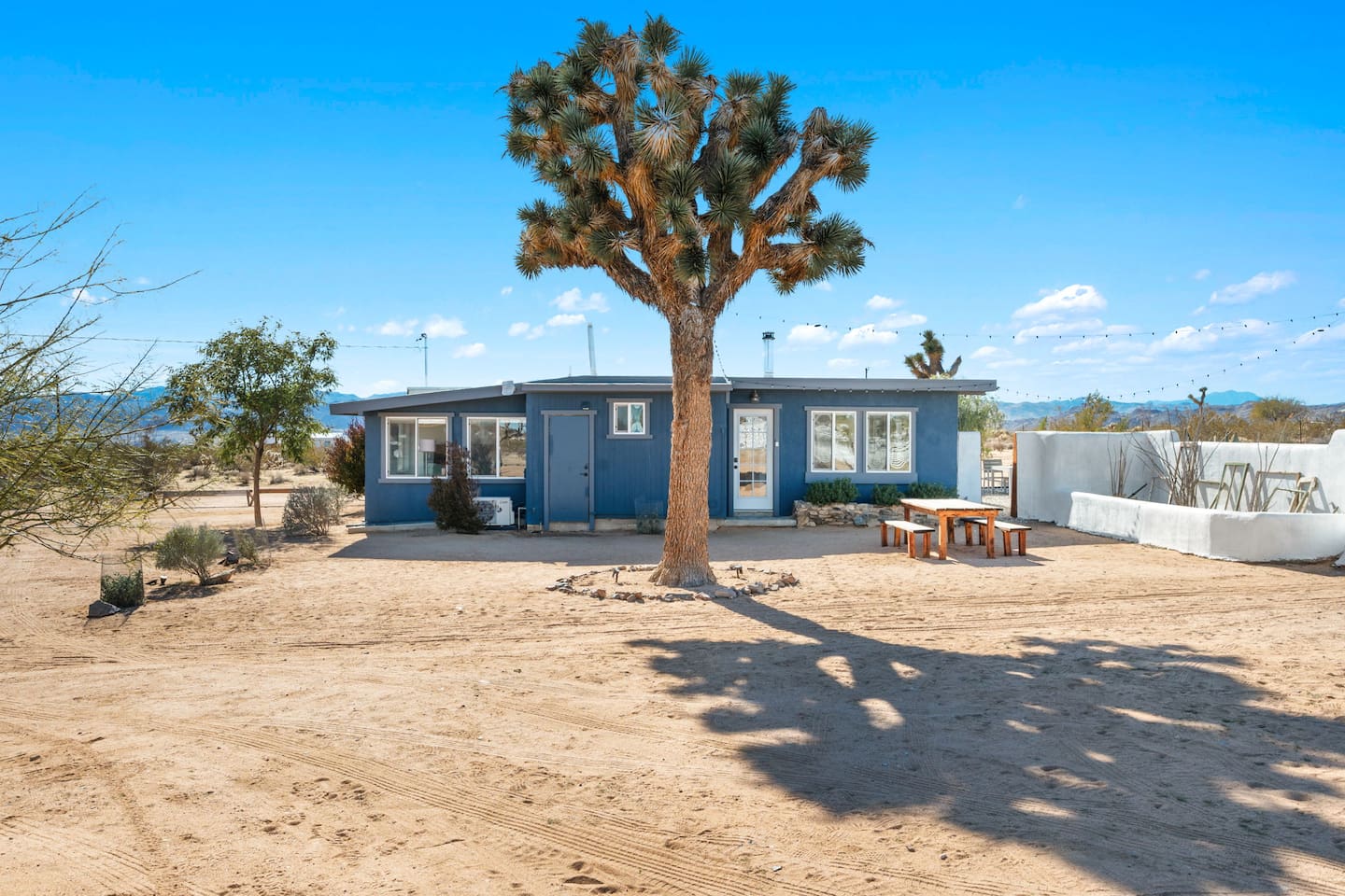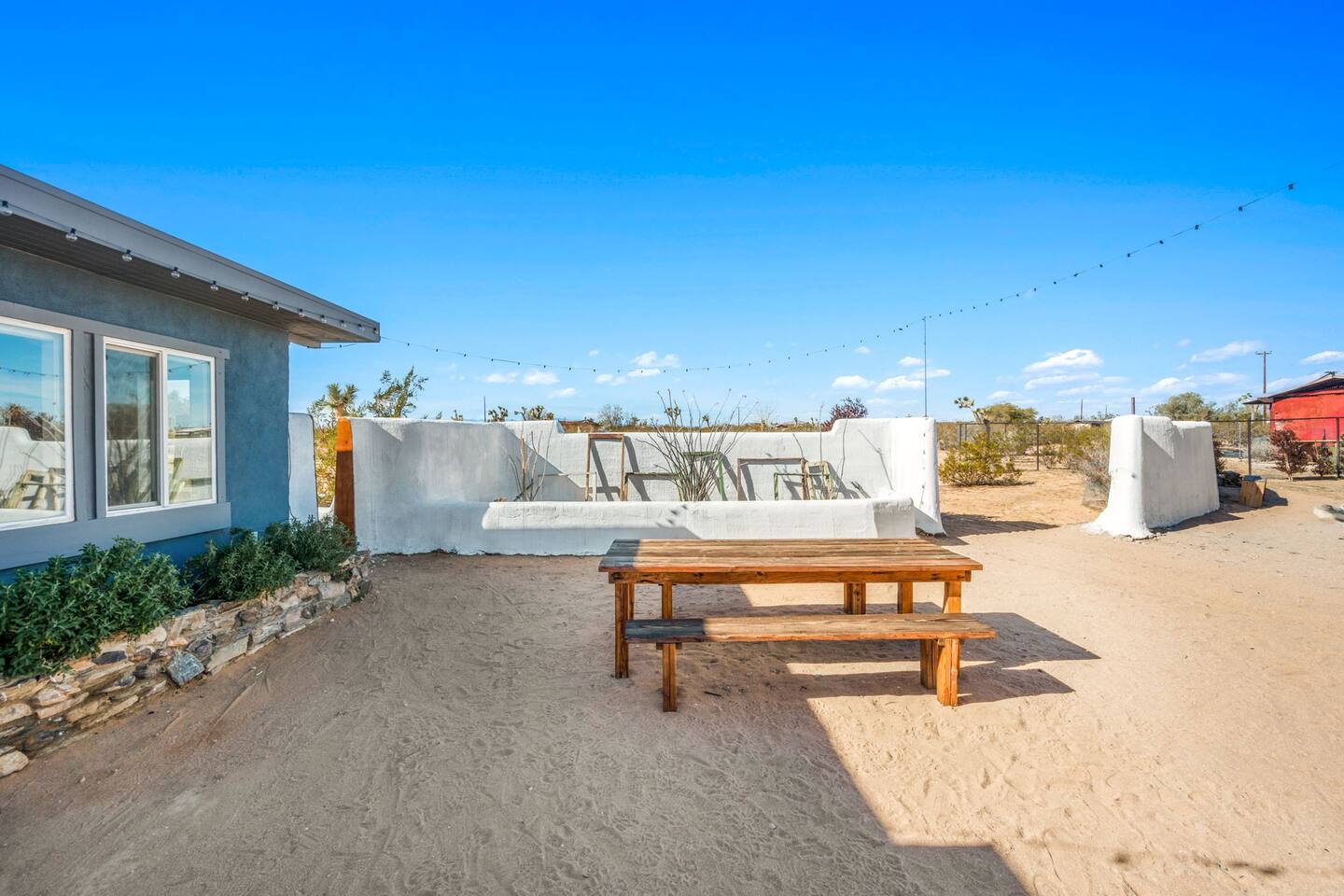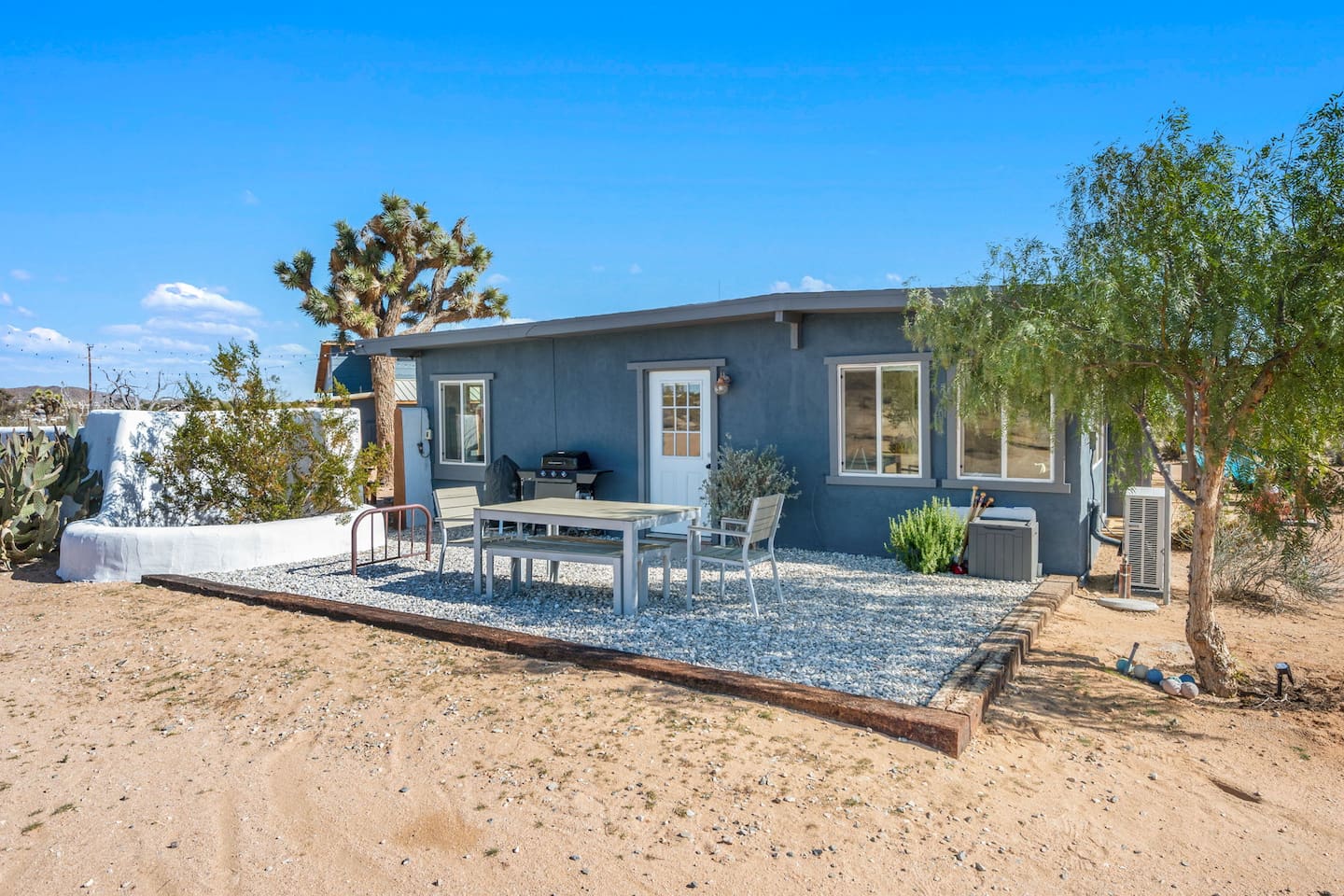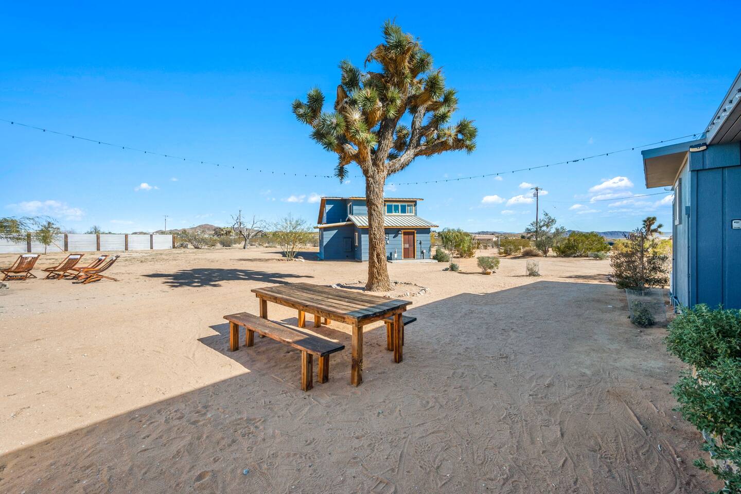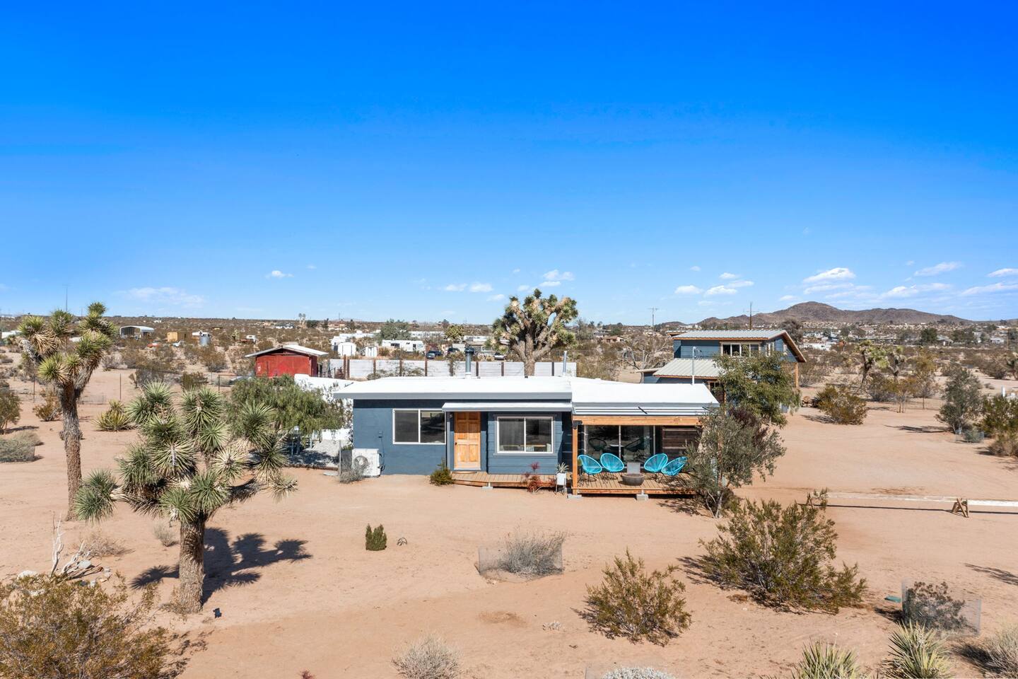 Inside, both homes feature fully equipped kitchens stocked with everything you need to cook up a delicious meal. Whether you prefer the ease of a Keurig or the tradition of a drip coffee maker, we’ve got you covered. Each kitchen also includes complimentary coffee and tea, cooking and baking basics, a toaster, microwave, and a gas range with oven—making meal prep simple and stress-free. Each house features two bedrooms and one bathroom, stocked with plush bedding, linens, towels, and toiletries for a comfortable stay. Main House: Bedroom 1 – Queen bed with a trundle single bed (for kids) Bedroom 2 – Queen bed with a trundle single bed (for kids) + a pack 'n play Living Room – Queen-size sleeper sofa & one queen air mattress Casita: Bedroom 1 – Queen bed Bedroom 2 – Queen bed with two single floor mattresses Living Room – Queen-size sleeper sofa & one queen air mattress Unwind under the stars in the hot tub or gather around the warmth of two gas firepits. Fire up the two outdoor grills to prepare a delicious feast, then enjoy your meal at the outdoor dining table or relax in the cozy lounge area. For entertainment, enjoy a classic evening by the wood firepit, challenge friends to a game of foosball or cornhole, or choose from a selection of board games for some friendly competition. With ample outdoor space to relax and connect, this Airbnb offers the perfect setting to unwind, socialize, and experience the beauty of Joshua Tree. Book your stay today and create unforgettable memories in this desert oasis!Inside, both homes feature fully equipped kitchens stocked with everything you need to cook up a delicious meal. Whether you prefer the ease of a Keurig or the tradition of a drip coffee maker, we’ve got you covered. Each kitchen also includes complimentary coffee and tea, cooking and baking basics, a toaster, microwave, and a gas range with oven—making meal prep simple and stress-free. Each house features two bedrooms and one bathroom, stocked with plush bedding, linens, towels, and toiletries for a comfortable stay. Main House: Bedroom 1 – Queen bed with a trundle single bed (for kids) Bedroom 2 – Queen bed with a trundle single bed (for kids) + a pack 'n play Living Room – Queen-size sleeper sofa & one queen air mattress Casita: Bedroom 1 – Queen bed Bedroom 2 – Queen bed with two single floor mattresses Living Room – Queen-size sleeper sofa & one queen air mattress Unwind under the stars in the hot tub or gather around the warmth of two gas firepits. Fire up the two outdoor grills to prepare a delicious feast, then enjoy your meal at the outdoor dining table or relax in the cozy lounge area. For entertainment, enjoy a classic evening by the wood firepit, challenge friends to a game of foosball or cornhole, or choose from a selection of board games for some friendly competition. With ample outdoor space to relax and connect, this Airbnb offers the perfect setting to unwind, socialize, and experience the beauty of Joshua Tree. Book your stay today and create unforgettable memories in this desert oasis!