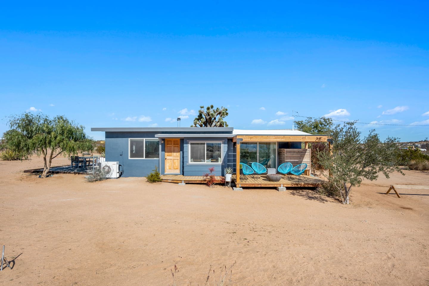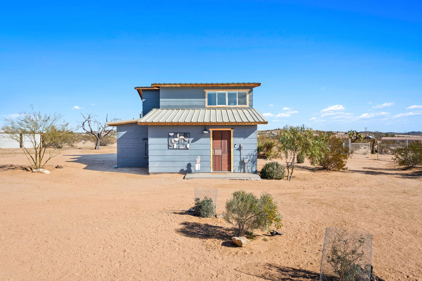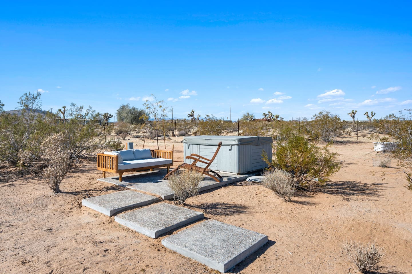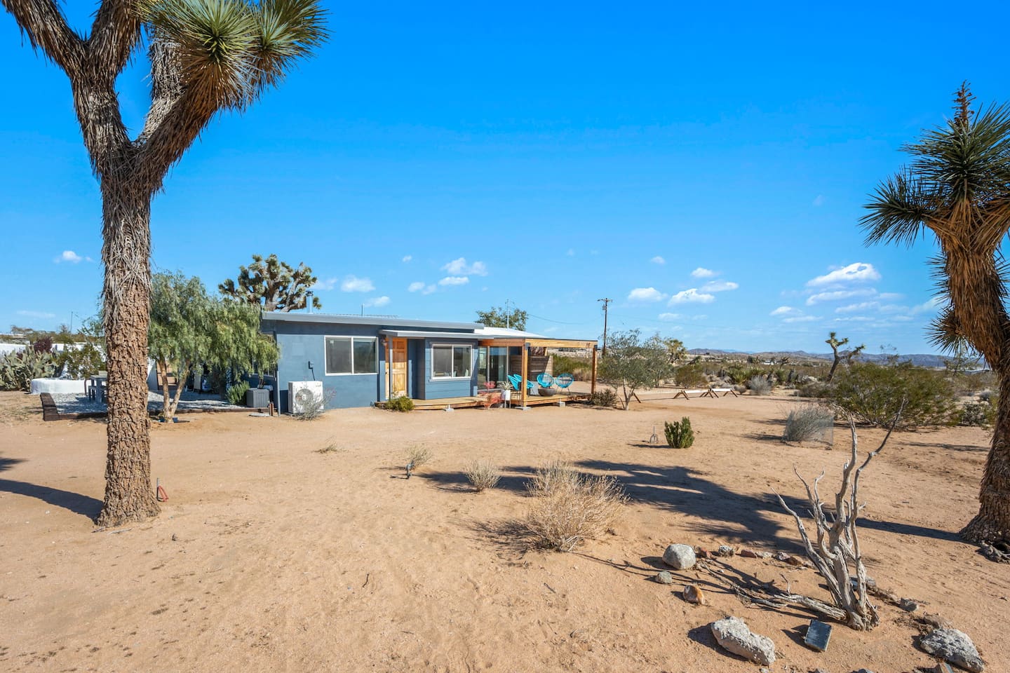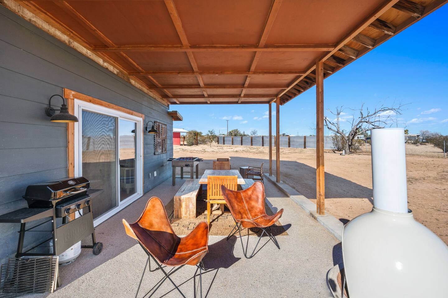Inside, both homes feature fully equipped kitchens stocked with everything you need to cook up a delicious meal. Whether you prefer the ease of a Keurig or the tradition of a drip coffee maker, we’ve got you covered. Each kitchen also includes complimentary coffee and tea, cooking and baking basics, a toaster, microwave, and a gas range with oven—making meal prep simple and stress-free. Each house features two bedrooms and one bathroom, stocked with plush bedding, linens, towels, and toiletries for a comfortable stay. Main House: Bedroom 1 – Queen bed with a trundle single bed (for kids) Bedroom 2 – Queen bed with a trundle single bed (for kids) + a pack 'n play Living Room – Queen-size sleeper sofa & one queen air mattress Casita: Bedroom 1 – Queen bed Bedroom 2 – Queen bed with two single floor mattresses Living Room – Queen-size sleeper sofa & one queen air mattress Unwind under the stars in the hot tub or gather around the warmth of two gas firepits. Fire up the two outdoor grills to prepare a delicious feast, then enjoy your meal at the outdoor dining table or relax in the cozy lounge area. For entertainment, enjoy a classic evening by the wood firepit, challenge friends to a game of foosball or cornhole, or choose from a selection of board games for some friendly competition. With ample outdoor space to relax and connect, this Airbnb offers the perfect setting to unwind, socialize, and experience the beauty of Joshua Tree. Book your stay today and create unforgettable memories in this desert oasis!Inside, both homes feature fully equipped kitchens stocked with everything you need to cook up a delicious meal. Whether you prefer the ease of a Keurig or the tradition of a drip coffee maker, we’ve got you covered. Each kitchen also includes complimentary coffee and tea, cooking and baking basics, a toaster, microwave, and a gas range with oven—making meal prep simple and stress-free. Each house features two bedrooms and one bathroom, stocked with plush bedding, linens, towels, and toiletries for a comfortable stay. Main House: Bedroom 1 – Queen bed with a trundle single bed (for kids) Bedroom 2 – Queen bed with a trundle single bed (for kids) + a pack 'n play Living Room – Queen-size sleeper sofa & one queen air mattress Casita: Bedroom 1 – Queen bed Bedroom 2 – Queen bed with two single floor mattresses Living Room – Queen-size sleeper sofa & one queen air mattress Unwind under the stars in the hot tub or gather around the warmth of two gas firepits. Fire up the two outdoor grills to prepare a delicious feast, then enjoy your meal at the outdoor dining table or relax in the cozy lounge area. For entertainment, enjoy a classic evening by the wood firepit, challenge friends to a game of foosball or cornhole, or choose from a selection of board games for some friendly competition. With ample outdoor space to relax and connect, this Airbnb offers the perfect setting to unwind, socialize, and experience the beauty of Joshua Tree. Book your stay today and create unforgettable memories in this desert oasis!