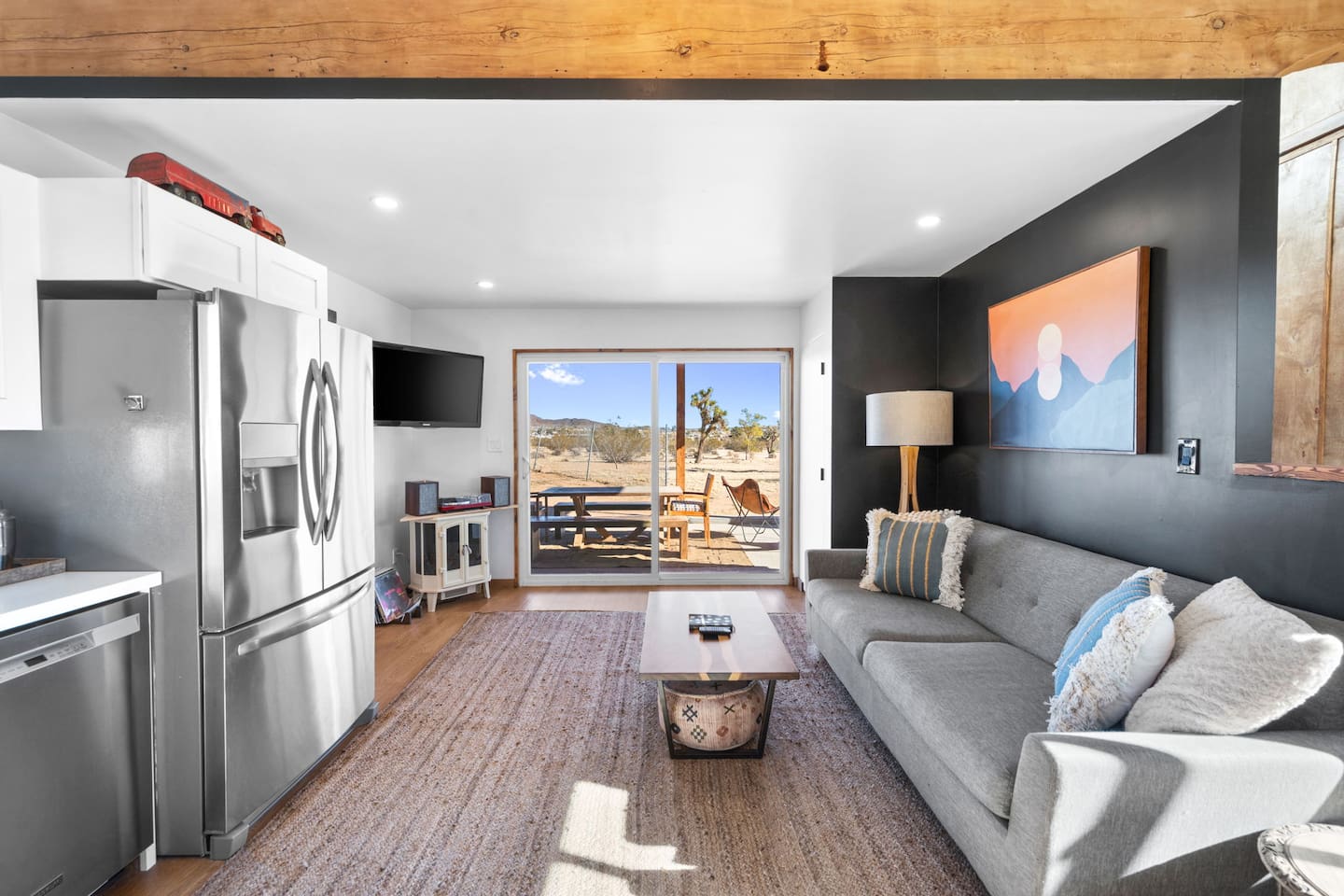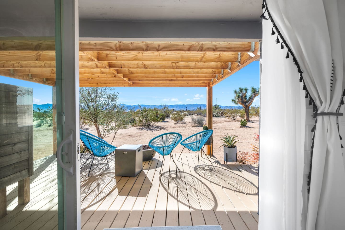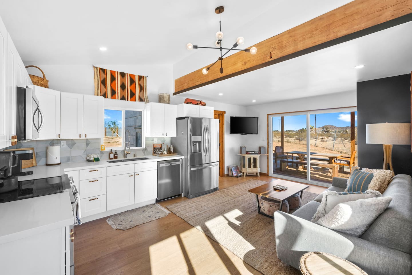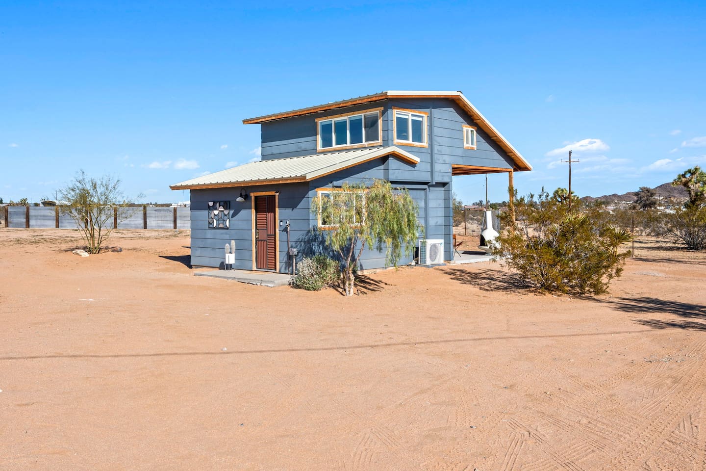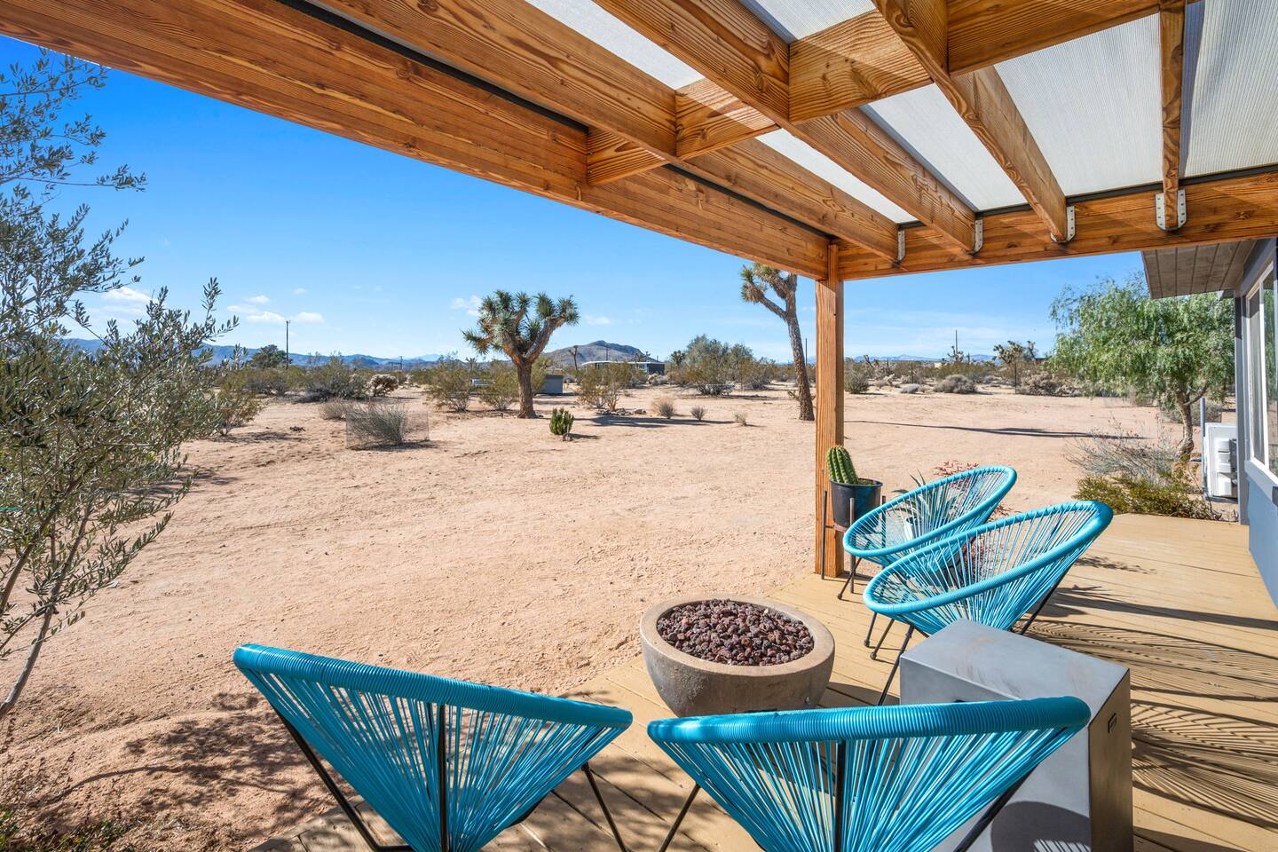Inside, both homes feature fully equipped kitchens stocked with everything you need to cook up a delicious meal. Whether you prefer the ease of a Keurig or the tradition of a drip coffee maker, we’ve got you covered. Each kitchen also includes complimentary coffee and tea, cooking and baking basics, a toaster, microwave, and a gas range with oven—making meal prep simple and stress-free. Each house features two bedrooms and one bathroom, stocked with plush bedding, linens, towels, and toiletries for a comfortable stay. Main House: Bedroom 1 – Queen bed with a trundle single bed (for kids) Bedroom 2 – Queen bed with a trundle single bed (for kids) + a pack 'n play Living Room – Queen-size sleeper sofa & one queen air mattress Casita: Bedroom 1 – Queen bed Bedroom 2 – Queen bed with two single floor mattresses Living Room – Queen-size sleeper sofa & one queen air mattress Unwind under the stars in the hot tub or gather around the warmth of two gas firepits. Fire up the two outdoor grills to prepare a delicious feast, then enjoy your meal at the outdoor dining table or relax in the cozy lounge area. For entertainment, enjoy a classic evening by the wood firepit, challenge friends to a game of foosball or cornhole, or choose from a selection of board games for some friendly competition. With ample outdoor space to relax and connect, this Airbnb offers the perfect setting to unwind, socialize, and experience the beauty of Joshua Tree. Book your stay today and create unforgettable memories in this desert oasis!Inside, both homes feature fully equipped kitchens stocked with everything you need to cook up a delicious meal. Whether you prefer the ease of a Keurig or the tradition of a drip coffee maker, we’ve got you covered. Each kitchen also includes complimentary coffee and tea, cooking and baking basics, a toaster, microwave, and a gas range with oven—making meal prep simple and stress-free. Each house features two bedrooms and one bathroom, stocked with plush bedding, linens, towels, and toiletries for a comfortable stay. Main House: Bedroom 1 – Queen bed with a trundle single bed (for kids) Bedroom 2 – Queen bed with a trundle single bed (for kids) + a pack 'n play Living Room – Queen-size sleeper sofa & one queen air mattress Casita: Bedroom 1 – Queen bed Bedroom 2 – Queen bed with two single floor mattresses Living Room – Queen-size sleeper sofa & one queen air mattress Unwind under the stars in the hot tub or gather around the warmth of two gas firepits. Fire up the two outdoor grills to prepare a delicious feast, then enjoy your meal at the outdoor dining table or relax in the cozy lounge area. For entertainment, enjoy a classic evening by the wood firepit, challenge friends to a game of foosball or cornhole, or choose from a selection of board games for some friendly competition. With ample outdoor space to relax and connect, this Airbnb offers the perfect setting to unwind, socialize, and experience the beauty of Joshua Tree. Book your stay today and create unforgettable memories in this desert oasis!