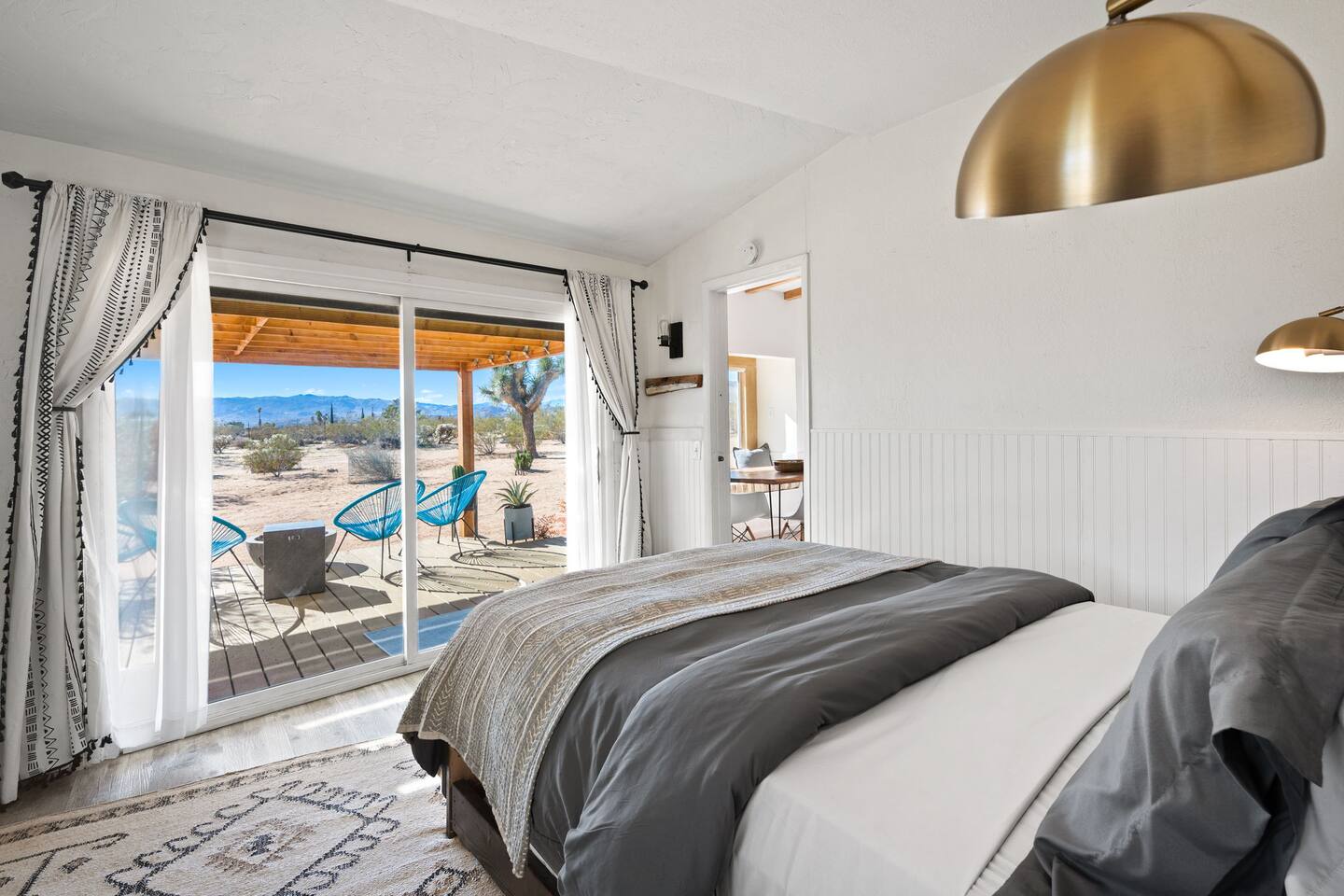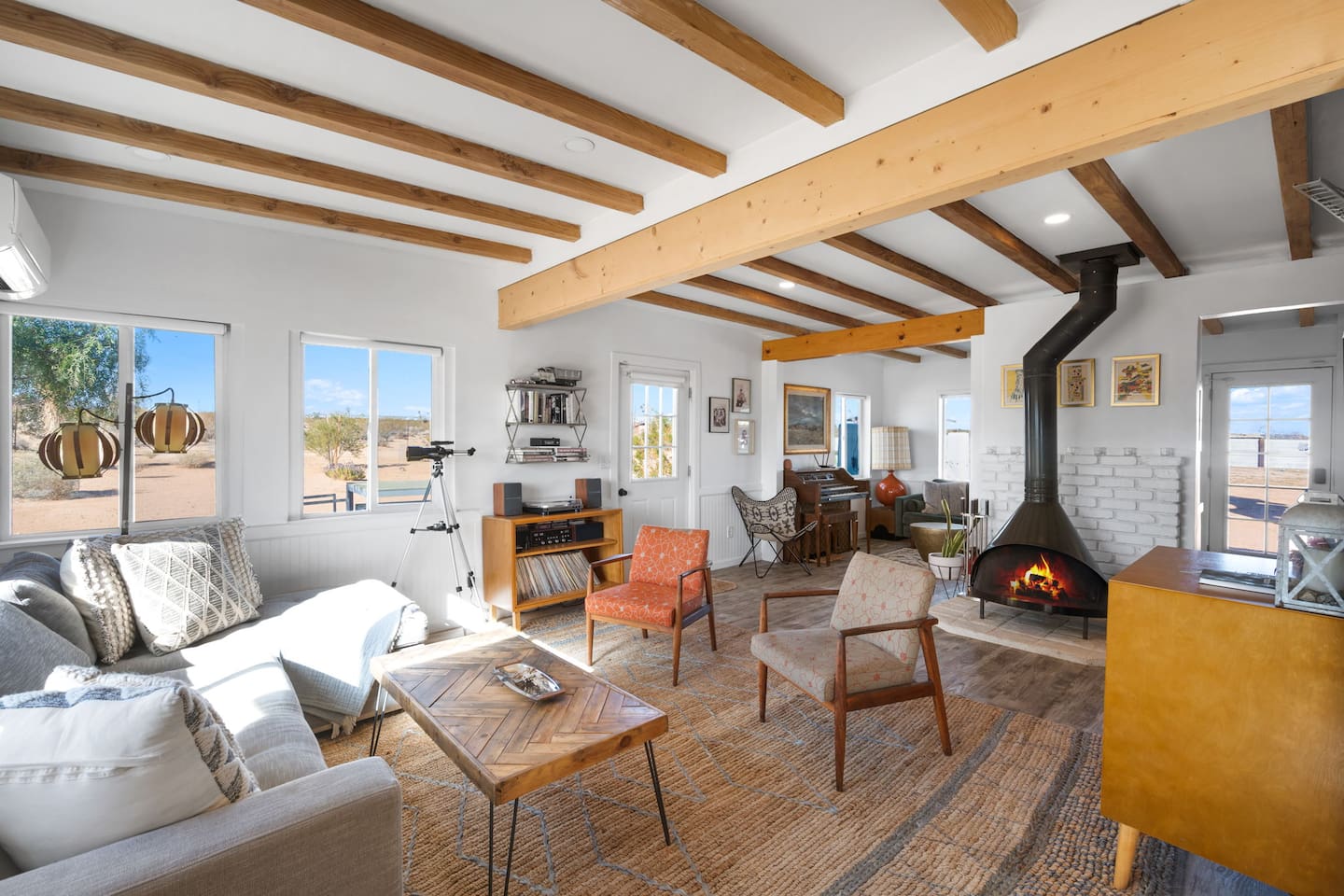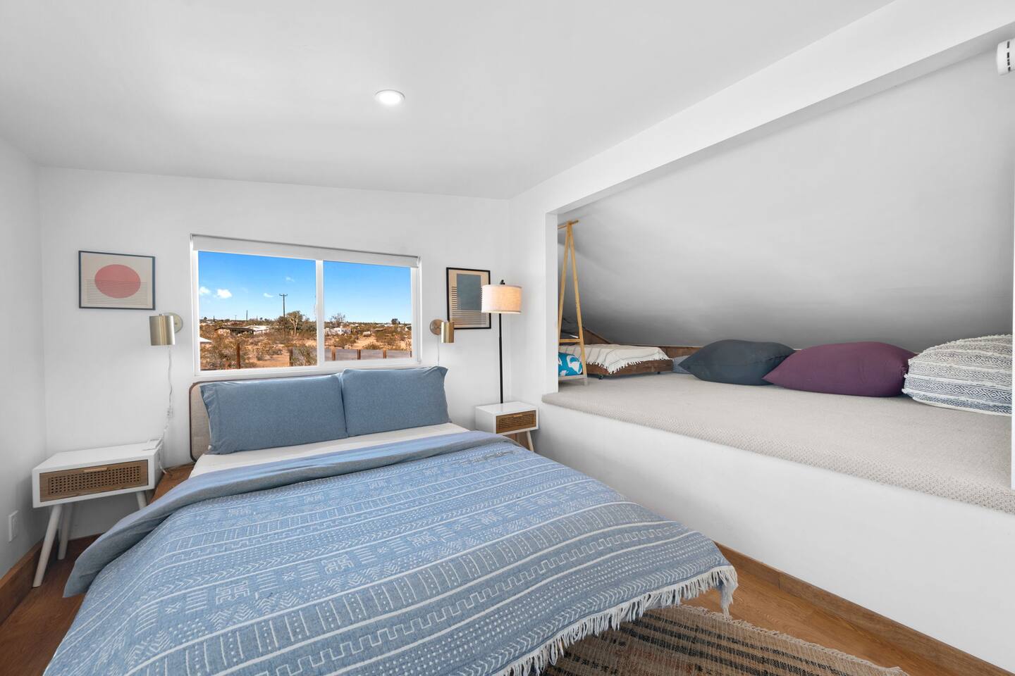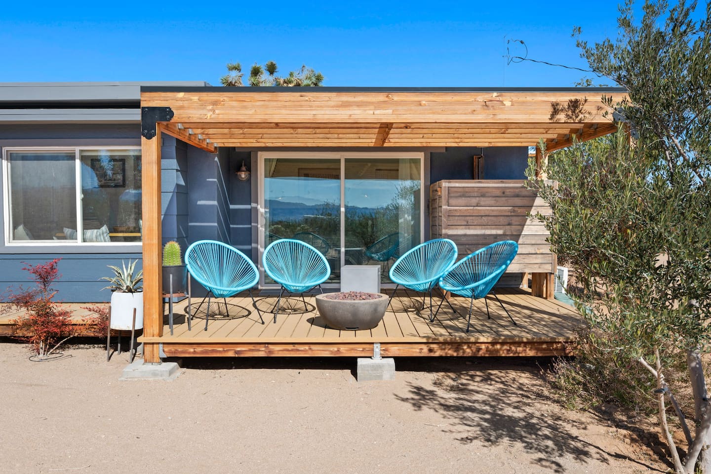 Inside, both homes feature fully equipped kitchens stocked with everything you need to cook up a delicious meal. Whether you prefer the ease of a Keurig or the tradition of a drip coffee maker, we’ve got you covered. Each kitchen also includes complimentary coffee and tea, cooking and baking basics, a toaster, microwave, and a gas range with oven—making meal prep simple and stress-free. Each house features two bedrooms and one bathroom, stocked with plush bedding, linens, towels, and toiletries for a comfortable stay. Main House: Bedroom 1 – Queen bed with a trundle single bed (for kids) Bedroom 2 – Queen bed with a trundle single bed (for kids) + a pack 'n play Living Room – Queen-size sleeper sofa & one queen air mattress Casita: Bedroom 1 – Queen bed Bedroom 2 – Queen bed with two single floor mattresses Living Room – Queen-size sleeper sofa & one queen air mattress Unwind under the stars in the hot tub or gather around the warmth of two gas firepits. Fire up the two outdoor grills to prepare a delicious feast, then enjoy your meal at the outdoor dining table or relax in the cozy lounge area. For entertainment, enjoy a classic evening by the wood firepit, challenge friends to a game of foosball or cornhole, or choose from a selection of board games for some friendly competition. With ample outdoor space to relax and connect, this Airbnb offers the perfect setting to unwind, socialize, and experience the beauty of Joshua Tree. Book your stay today and create unforgettable memories in this desert oasis!Inside, both homes feature fully equipped kitchens stocked with everything you need to cook up a delicious meal. Whether you prefer the ease of a Keurig or the tradition of a drip coffee maker, we’ve got you covered. Each kitchen also includes complimentary coffee and tea, cooking and baking basics, a toaster, microwave, and a gas range with oven—making meal prep simple and stress-free. Each house features two bedrooms and one bathroom, stocked with plush bedding, linens, towels, and toiletries for a comfortable stay. Main House: Bedroom 1 – Queen bed with a trundle single bed (for kids) Bedroom 2 – Queen bed with a trundle single bed (for kids) + a pack 'n play Living Room – Queen-size sleeper sofa & one queen air mattress Casita: Bedroom 1 – Queen bed Bedroom 2 – Queen bed with two single floor mattresses Living Room – Queen-size sleeper sofa & one queen air mattress Unwind under the stars in the hot tub or gather around the warmth of two gas firepits. Fire up the two outdoor grills to prepare a delicious feast, then enjoy your meal at the outdoor dining table or relax in the cozy lounge area. For entertainment, enjoy a classic evening by the wood firepit, challenge friends to a game of foosball or cornhole, or choose from a selection of board games for some friendly competition. With ample outdoor space to relax and connect, this Airbnb offers the perfect setting to unwind, socialize, and experience the beauty of Joshua Tree. Book your stay today and create unforgettable memories in this desert oasis!
