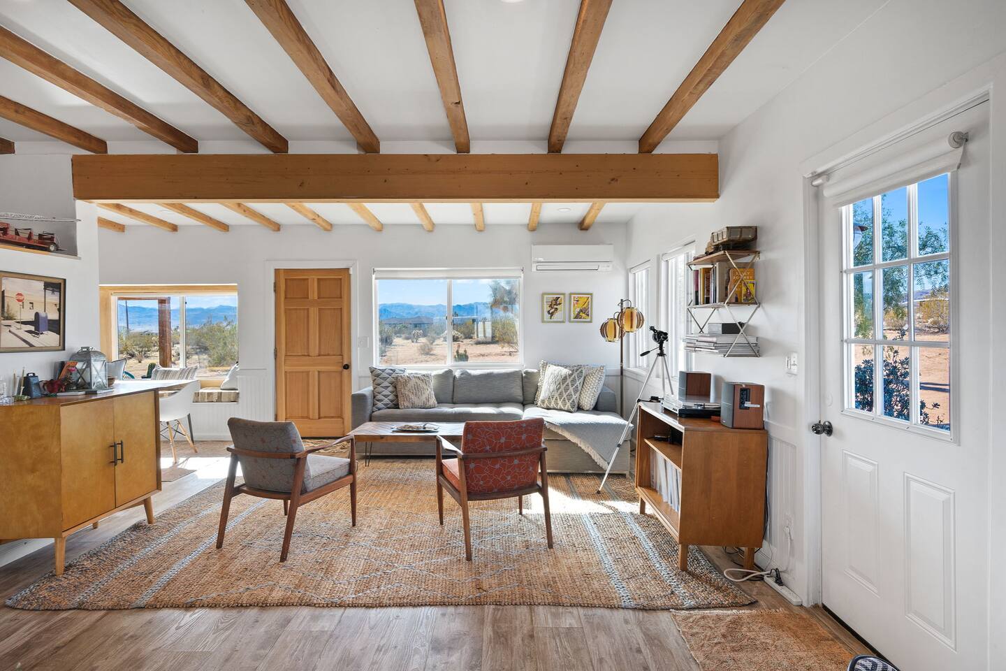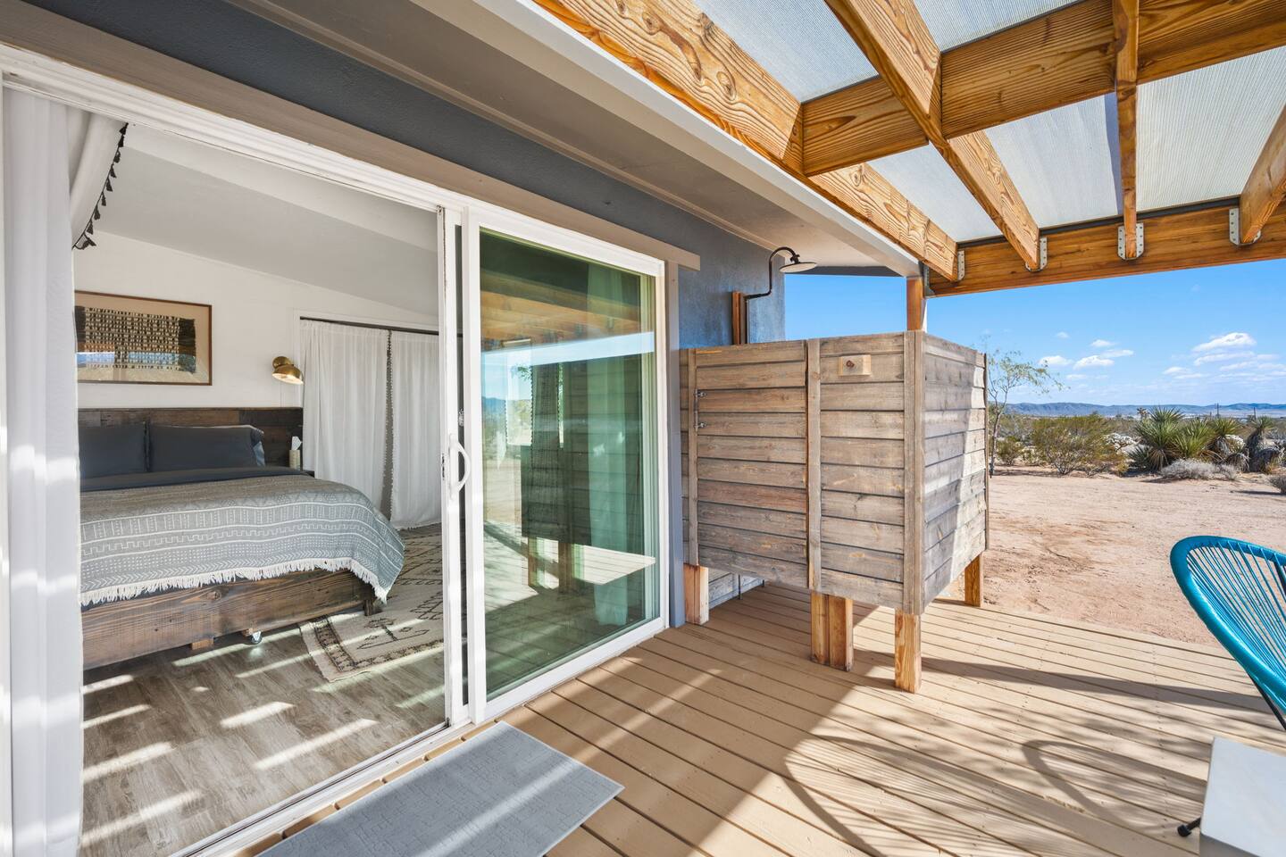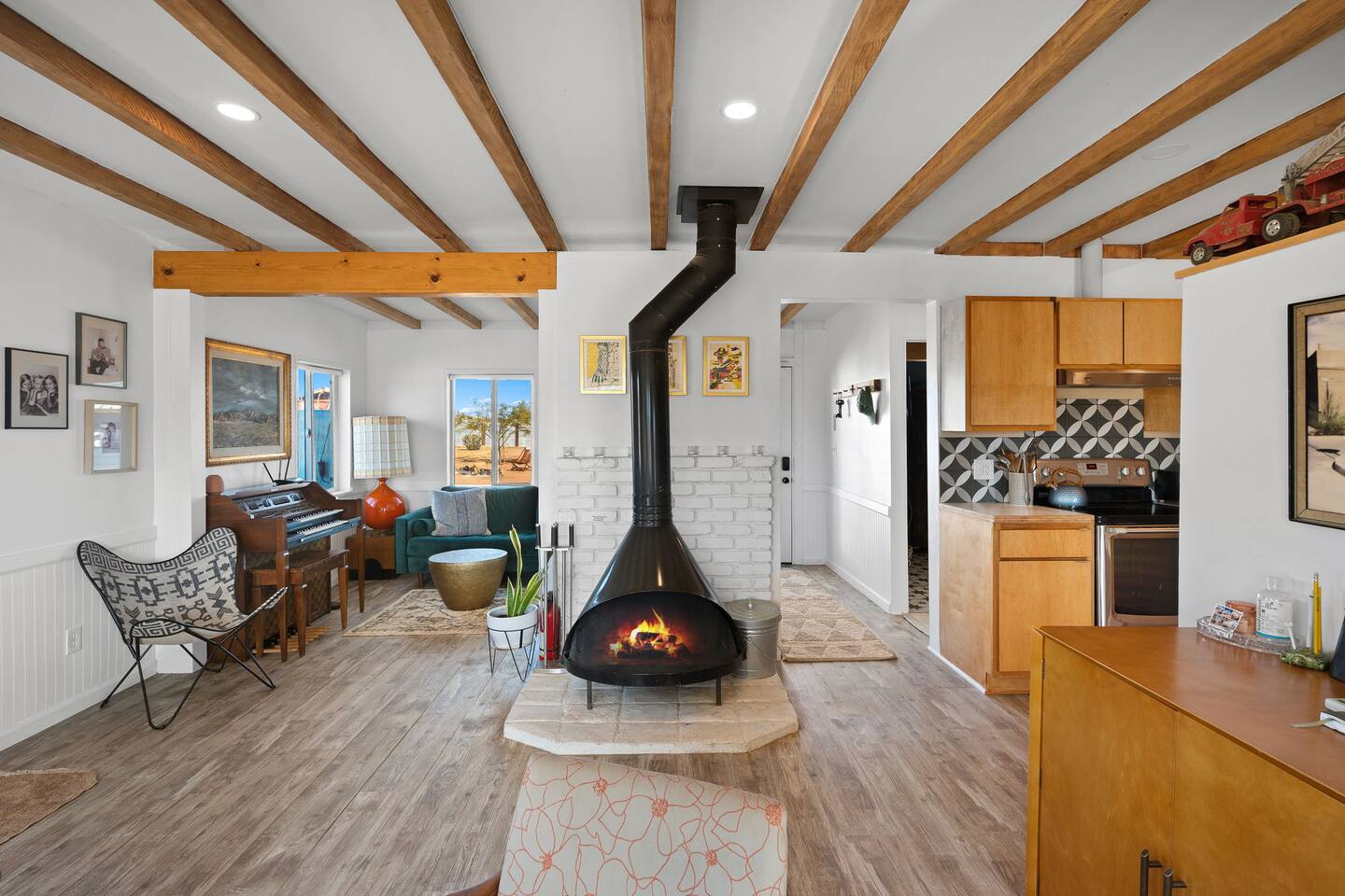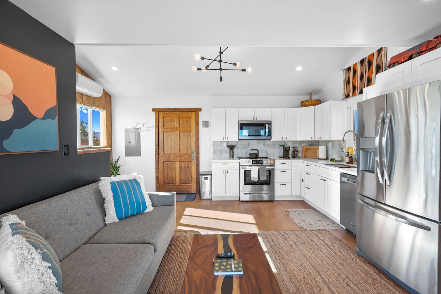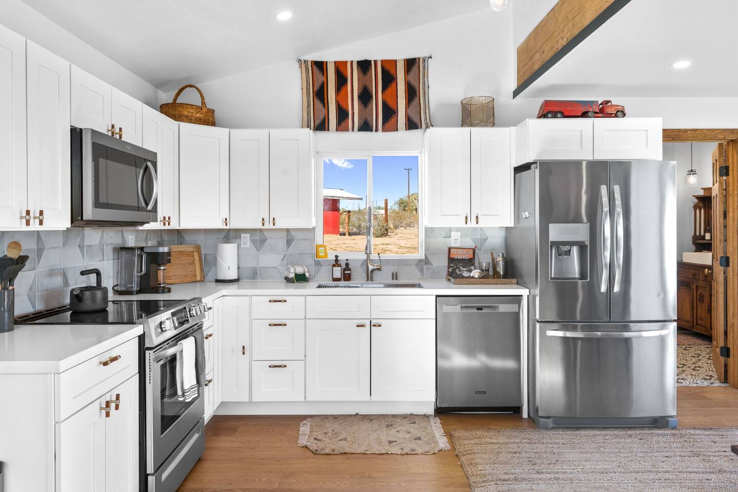 Inside, both homes feature fully equipped kitchens stocked with everything you need to cook up a delicious meal. Whether you prefer the ease of a Keurig or the tradition of a drip coffee maker, we’ve got you covered. Each kitchen also includes complimentary coffee and tea, cooking and baking basics, a toaster, microwave, and a gas range with oven—making meal prep simple and stress-free. Each house features two bedrooms and one bathroom, stocked with plush bedding, linens, towels, and toiletries for a comfortable stay. Main House: Bedroom 1 – Queen bed with a trundle single bed (for kids) Bedroom 2 – Queen bed with a trundle single bed (for kids) + a pack 'n play Living Room – Queen-size sleeper sofa & one queen air mattress Casita: Bedroom 1 – Queen bed Bedroom 2 – Queen bed with two single floor mattresses Living Room – Queen-size sleeper sofa & one queen air mattress Unwind under the stars in the hot tub or gather around the warmth of two gas firepits. Fire up the two outdoor grills to prepare a delicious feast, then enjoy your meal at the outdoor dining table or relax in the cozy lounge area. For entertainment, enjoy a classic evening by the wood firepit, challenge friends to a game of foosball or cornhole, or choose from a selection of board games for some friendly competition. With ample outdoor space to relax and connect, this Airbnb offers the perfect setting to unwind, socialize, and experience the beauty of Joshua Tree. Book your stay today and create unforgettable memories in this desert oasis!Inside, both homes feature fully equipped kitchens stocked with everything you need to cook up a delicious meal. Whether you prefer the ease of a Keurig or the tradition of a drip coffee maker, we’ve got you covered. Each kitchen also includes complimentary coffee and tea, cooking and baking basics, a toaster, microwave, and a gas range with oven—making meal prep simple and stress-free. Each house features two bedrooms and one bathroom, stocked with plush bedding, linens, towels, and toiletries for a comfortable stay. Main House: Bedroom 1 – Queen bed with a trundle single bed (for kids) Bedroom 2 – Queen bed with a trundle single bed (for kids) + a pack 'n play Living Room – Queen-size sleeper sofa & one queen air mattress Casita: Bedroom 1 – Queen bed Bedroom 2 – Queen bed with two single floor mattresses Living Room – Queen-size sleeper sofa & one queen air mattress Unwind under the stars in the hot tub or gather around the warmth of two gas firepits. Fire up the two outdoor grills to prepare a delicious feast, then enjoy your meal at the outdoor dining table or relax in the cozy lounge area. For entertainment, enjoy a classic evening by the wood firepit, challenge friends to a game of foosball or cornhole, or choose from a selection of board games for some friendly competition. With ample outdoor space to relax and connect, this Airbnb offers the perfect setting to unwind, socialize, and experience the beauty of Joshua Tree. Book your stay today and create unforgettable memories in this desert oasis!